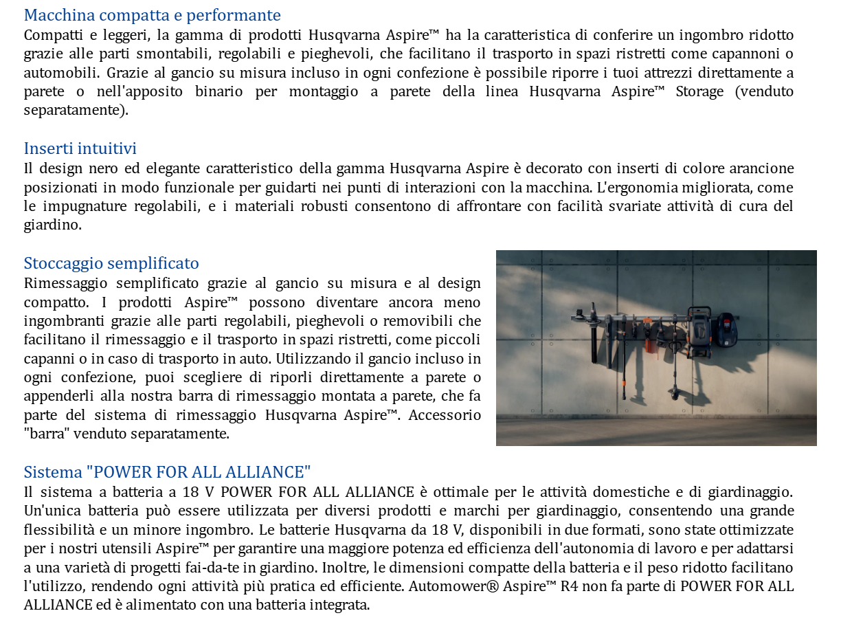 Questo bordatore a batteria da 18 V con testina a doppio filo assicura bordi perfetti con un'elevata efficienza. Husqvarna Aspire™ T28-P4A è progettato per spazi ridotti e il rimessaggio è semplificato grazie al gancio incluso. L'impugnatura ad anello e l'albero telescopico possono essere regolati per una posizione di lavoro confortevole. Come tutti i prodotti della gamma Husqvarna Aspire™, presenta un elegante design nero completato da dettagli arancioni che guidano l'utente in modo intuitivo verso tutti i punti di interazione. Il sistema di batterie POWER FOR ALL ALLIANCE da 18 V offre flessibilità e garantisce la riduzione dello spazio di rimessaggio poiché una batteria può essere utilizzata per diversi strumenti e marchi di giardinaggio.