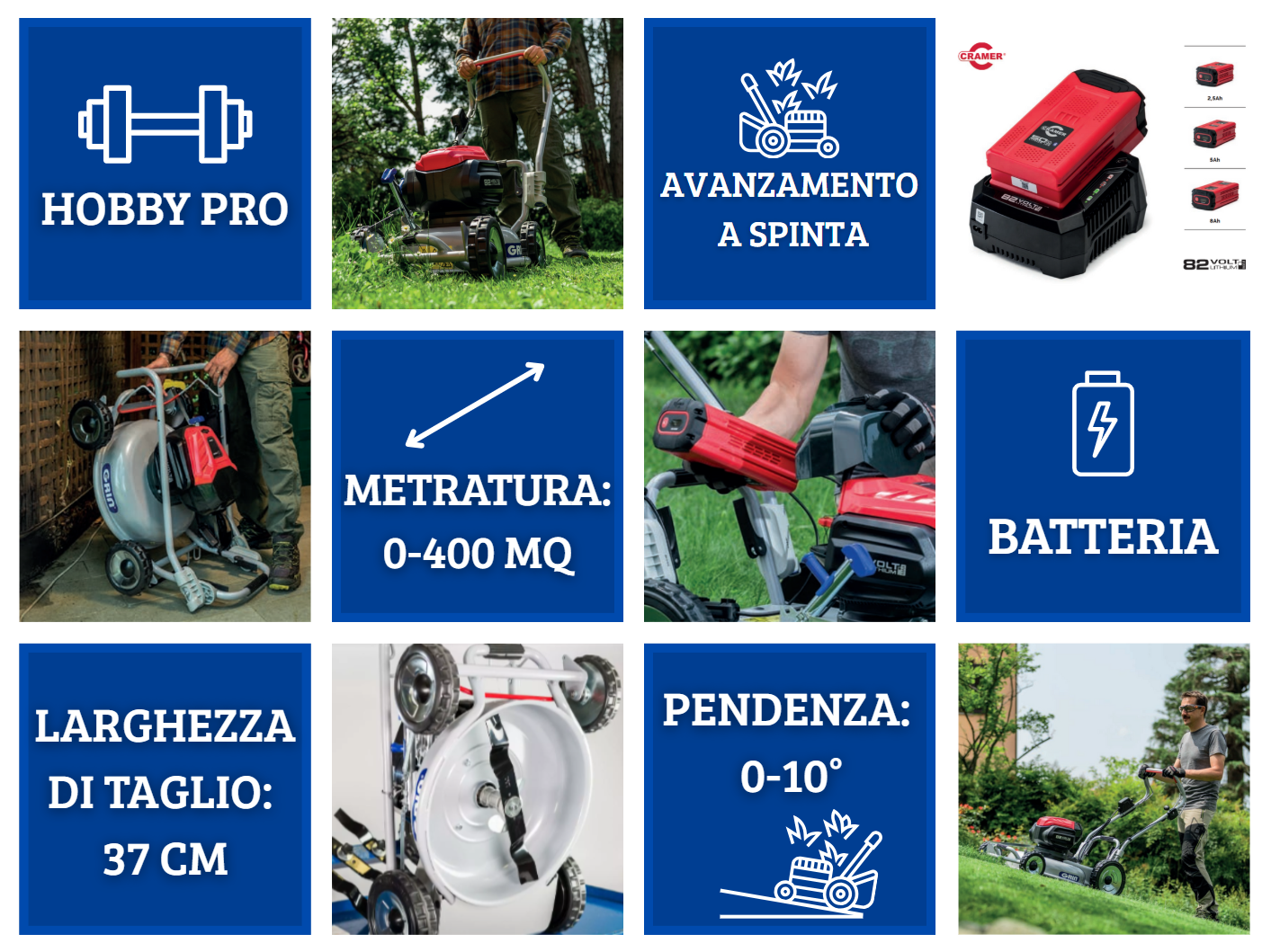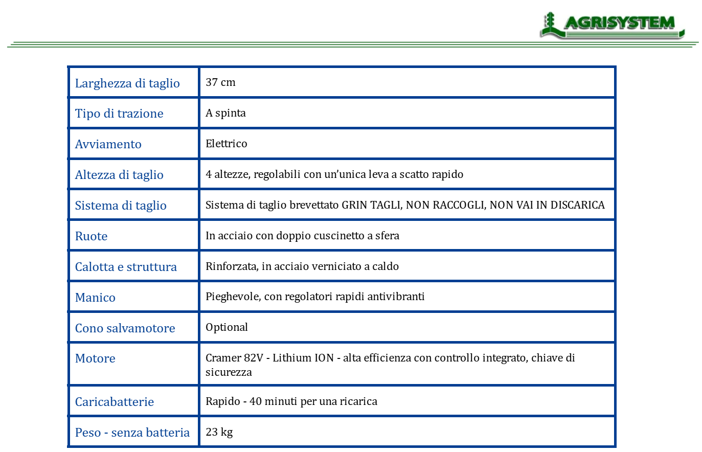 GRIN BM37 è una macchina con motore elettrico Cramer alimentato da una batteria agli Ioni di Litio da 82V. La batteria da 2,5Ah e 82V permette di tagliare fino a 500-600 mq di prato, in condizioni normali, con una sola carica. Costruita su telaio GRIN monta un motore elettrico da 1,5 KW che permette di avere prestazioni simili a quelle di una macchina con motore a scoppio. L’elettronica permette una variazione del numero dei giri motore da 2.600 a 2.900 rpm, ottimizzando la durata della batteria grazie alla variazione automatica dello sforzo. La struttura è la stessa di un GRIN con motore a scoppio. Struttura e motore ne fanno una macchina apprezzata per i piccoli spazi dove è necessario abbinare prestazioni all’esigenza di diminuire rumorosità, agenti inquinanti e manutenzione del motore.