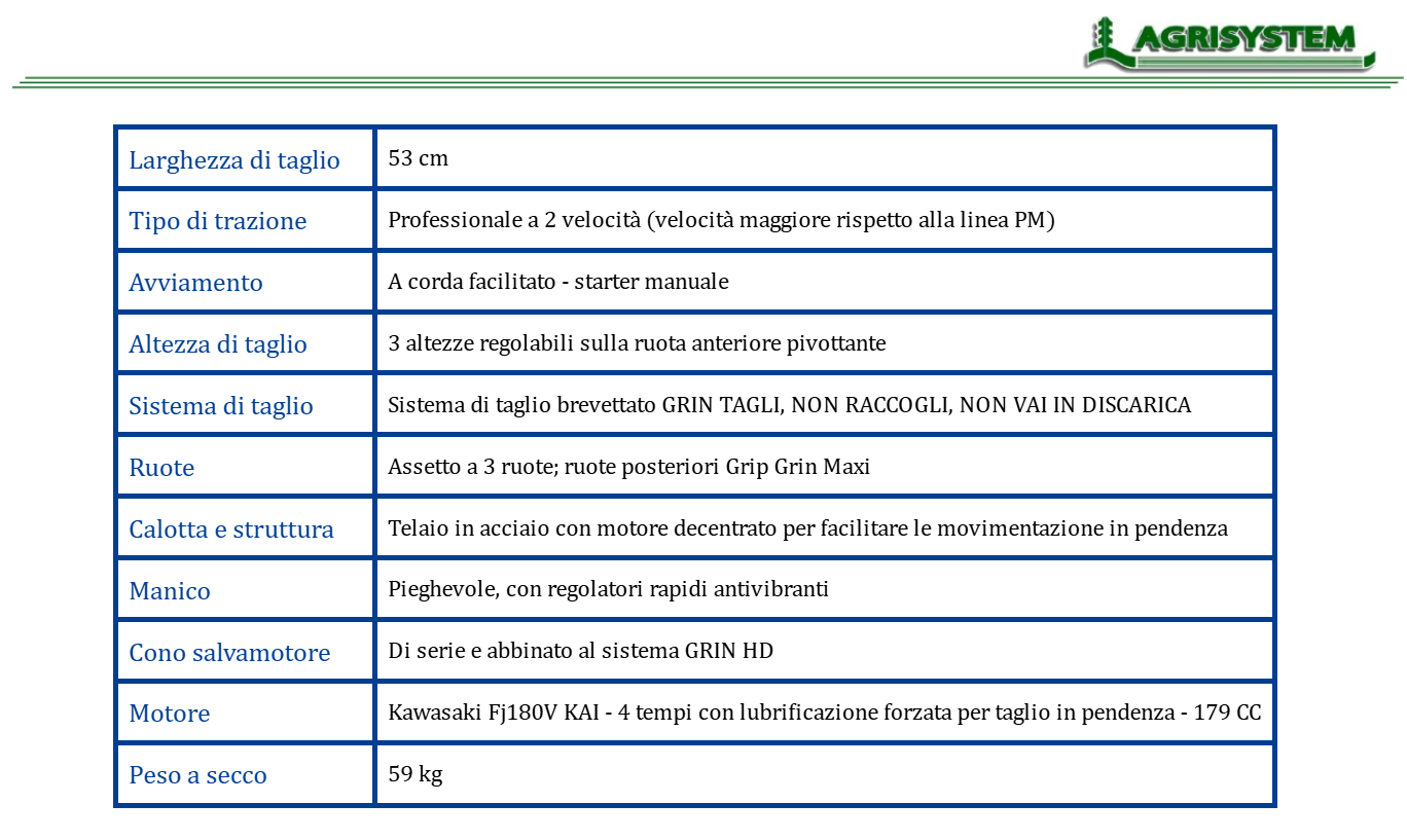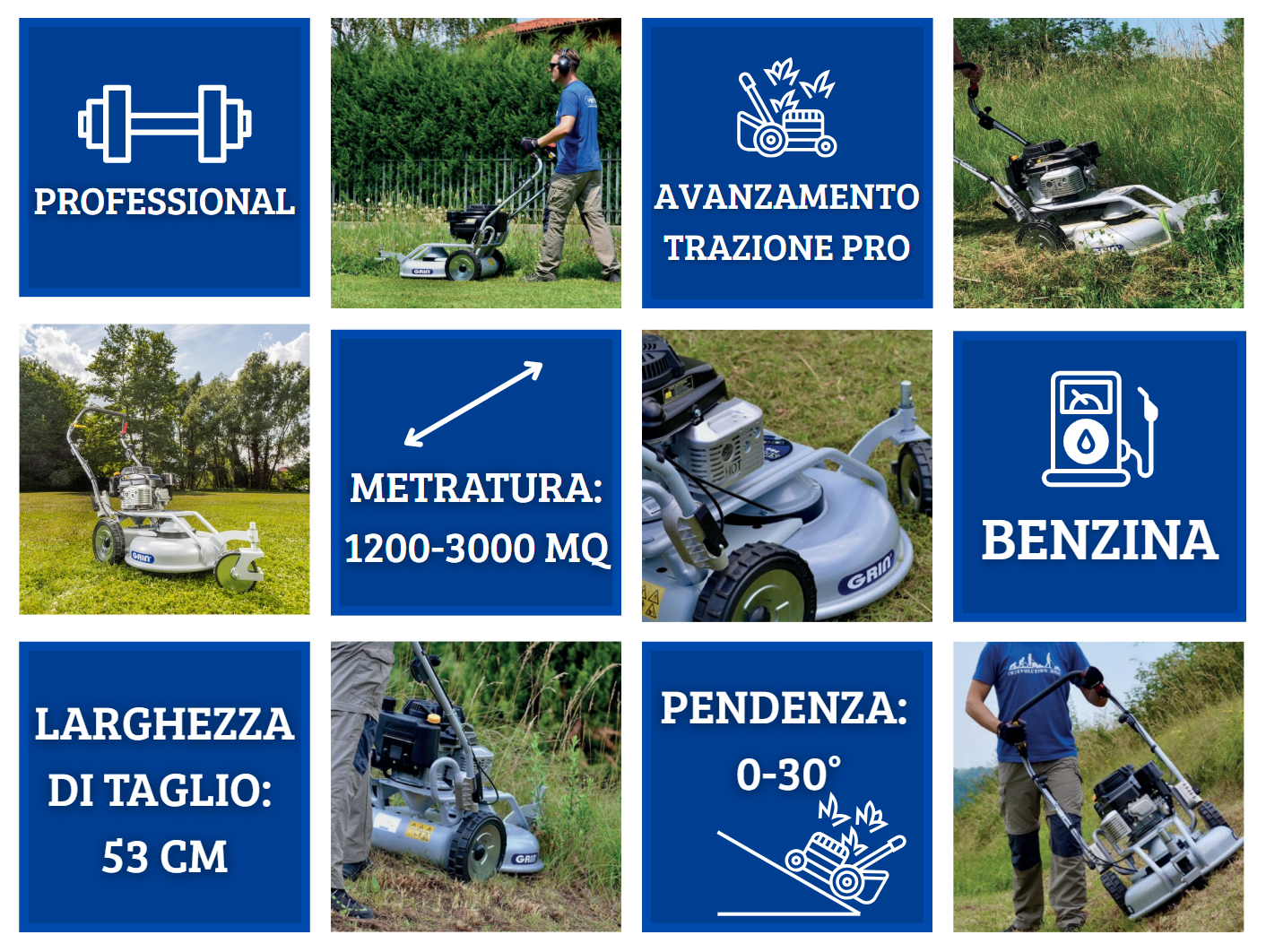 GRIN SPM53A KW è una macchina a 3 ruote, con motore Kawasaki professionale decentrato, ideale per la manutenzione in erba molto alta e in situazioni di forte pendenza. La struttura si basa sull’innovativo telaio a ponte GRIN HD. Si distingue per un’elevata velocità di taglio che permette la manutenzione di 2.000 mq ogni ora. La ruota pivottante anteriore bloccabile, le ruote posteriori GRIP GRIN MAXI e l’ottimale bilanciamento dei pesi rendono questa macchina molto agile e facile da manovrare. Il motore professionale Kawasaki è dotato di un sistema a lubrificazione forzata, che permette il taglio anche su pendenze importanti. Pensata per un utilizzo professionale in erba alta, si adatta perfettamente ai prati complessi, in cui si alternano varie situazioni di taglio.