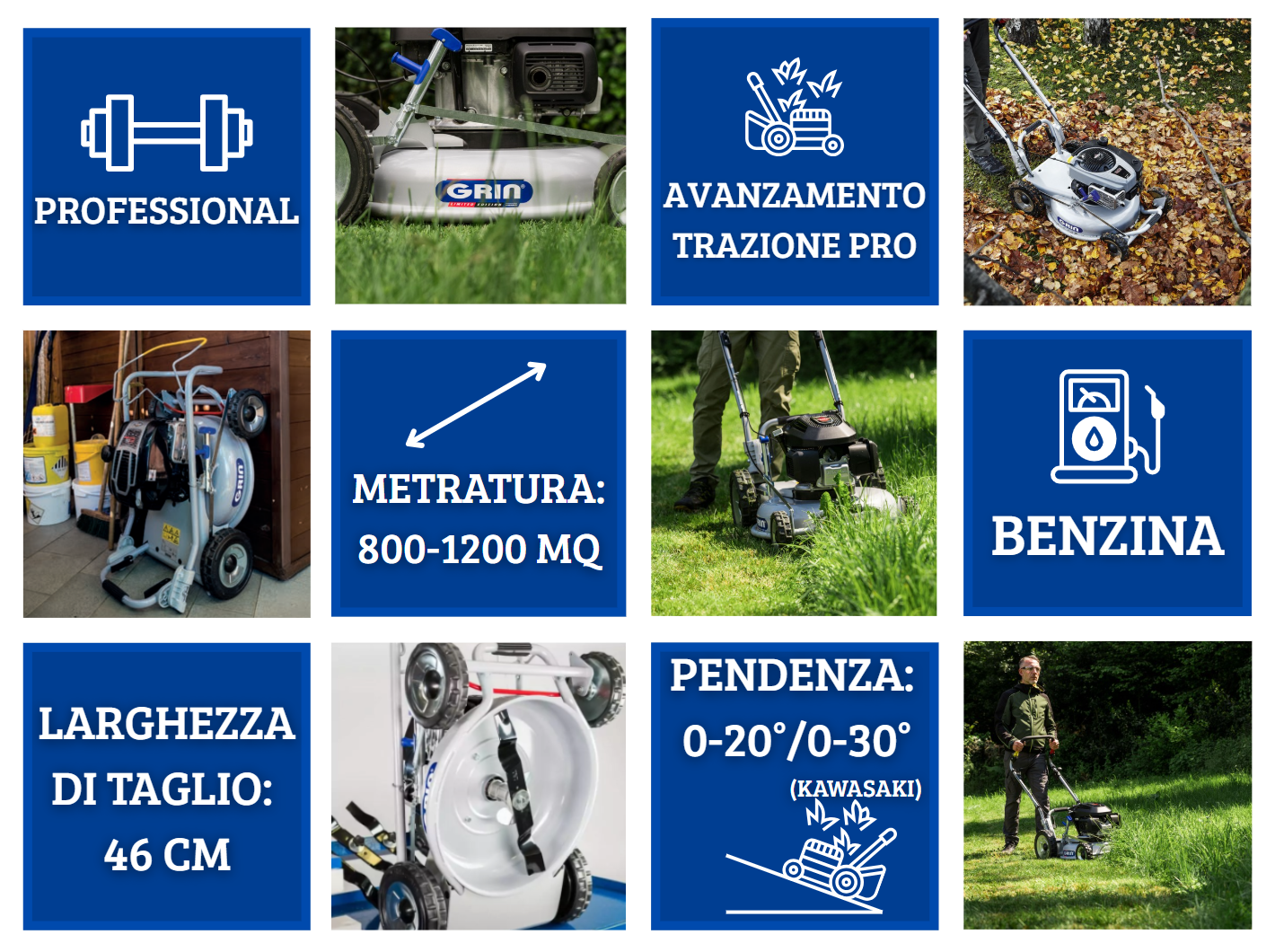 GRIN PM46A è un tagliaerba trazionato disponibile in 4 motorizzazioni. Il gruppo trazione professionale a 2 VELOCITA’, in scatolato di alluminio stagno a bagno d’olio, è affidabile e potente e permette di regolare la velocità a seconda delle condizioni del prato. L’innovativa concezione della trazione, sostenuta dagli “assali sospesi GRIN” permette di aumentare la resistenza agli urti e preserva il meccanismo nel tempo. Ideale per una manutenzione professionale, è una macchina che dà il meglio di sé nelle situazioni difficili. I manutentori che la utilizzano sono stupiti della capacità di polverizzazione anche in erba alta e umida. Il CONO SALVAMOTORE è di serie.