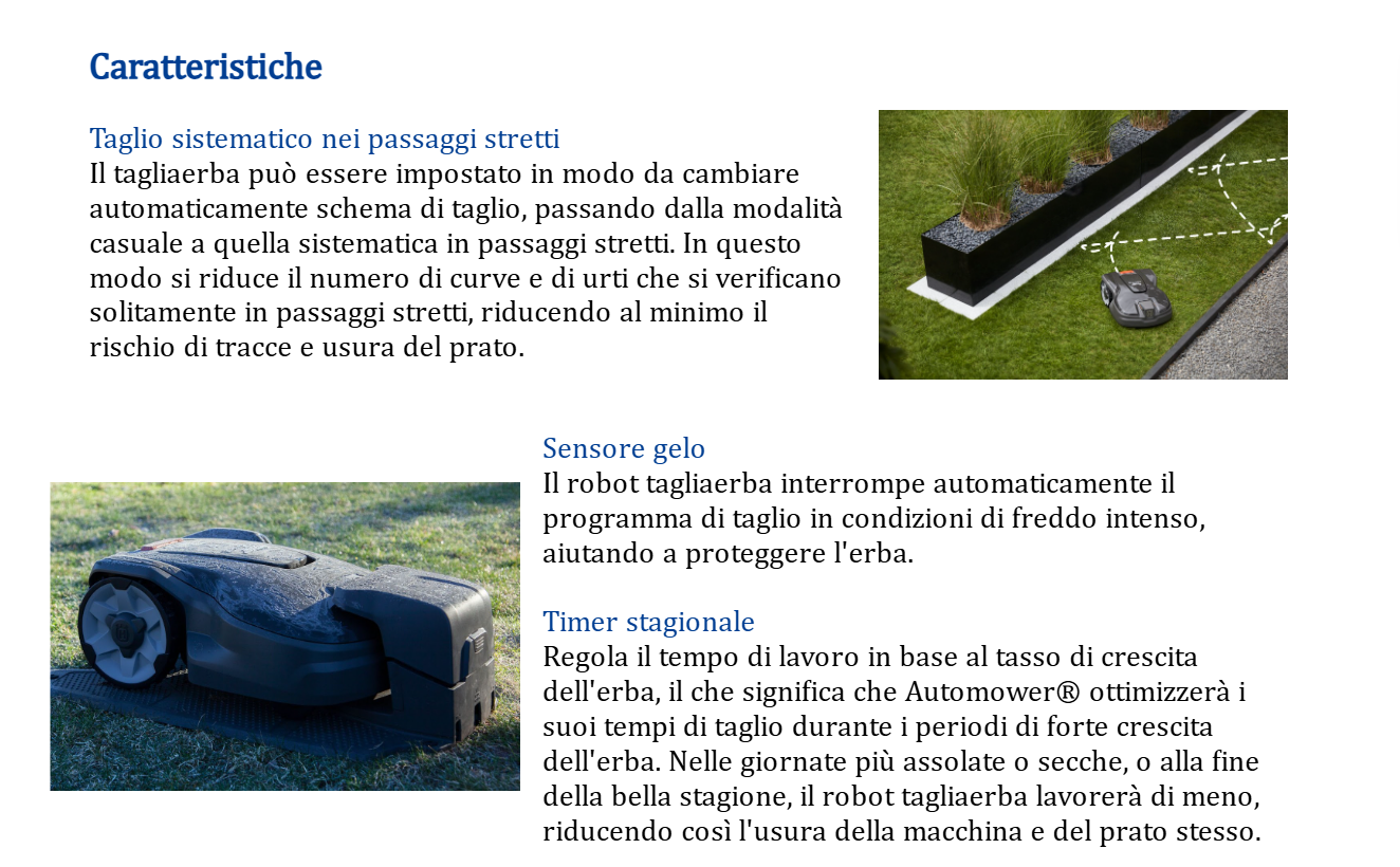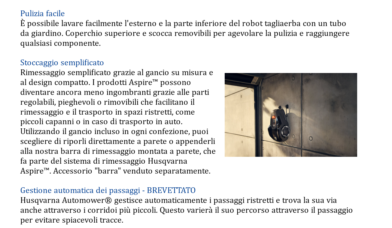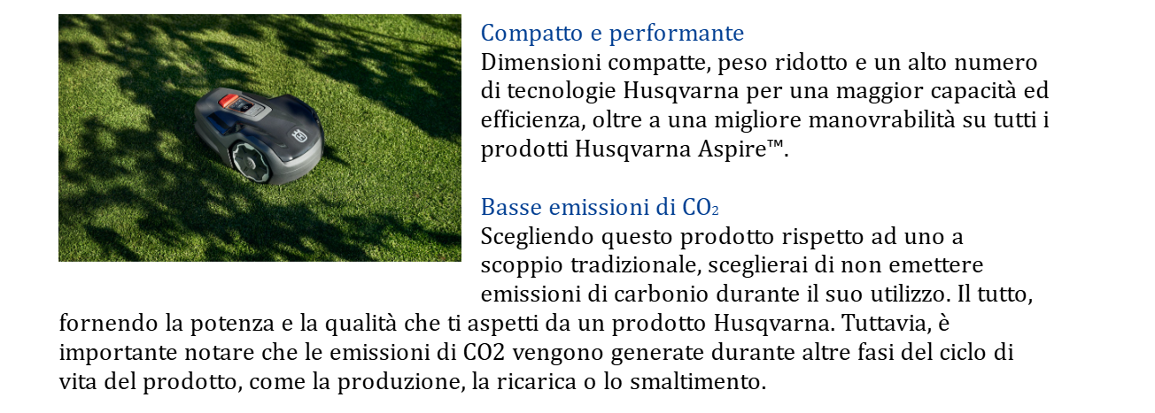 Robot tagliaerba compatto, ottimizzato per il taglio di prati di piccole dimensioni e passaggi stretti. Husqvarna Automower® Aspire™ R4 è dotato di protezione gelo e di timer stagionale che regola il taglio in base alle condizioni atmosferiche, garantendo un funzionamento affidabile e risultati ottimali. Con l'app Automower® Connect, è possibile avere il pieno controllo del tagliaerba, gestendolo e monitorandolo tramite telefono cellulare. Il tagliaerba può anche essere integrato con i dispositivi domotici, in modo da poter utilizzare il controllo vocale con Alexa o Google Home oppure sfruttare le routine IFTTT. Il rimessaggio è facilitato dal design compatto e dai ganci Aspire™ inclusi.