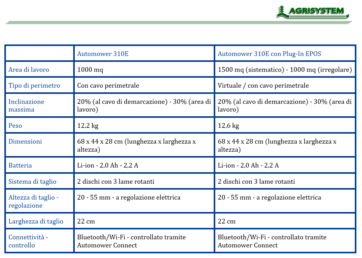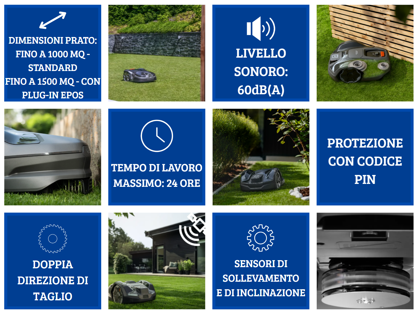 Husqvarna Automower® 310E NERA è un robot tagliaerba per prati fino a 1000/1500 m². È dotato di una funzione EdgeCut che riduce al minimo la necessità di tagliare i bordi del prato, risparmiando tempo e fatica. ll 310E NERA offre inoltre la possibilità di scegliere tra l'installazione classica con filo perimetrale o tramite confini virtuali grazie al plug-in Husqvarna EPOS™. Con Husqvarna EPOS™ potrai personalizzare il tuo prato creando diverse aree di lavoro con impostazioni differenti e zone momentanee da escludere dal taglio, il tutto comodamente dal tuo smartphone tramite l'app Automower® Connect, il quale ti permette di monitorare il tuo robot tagliaerba in qualsiasi momento e può anche essere integrato alla tua smart home.