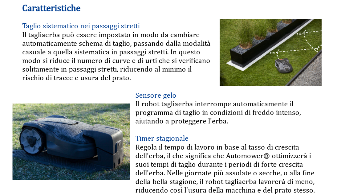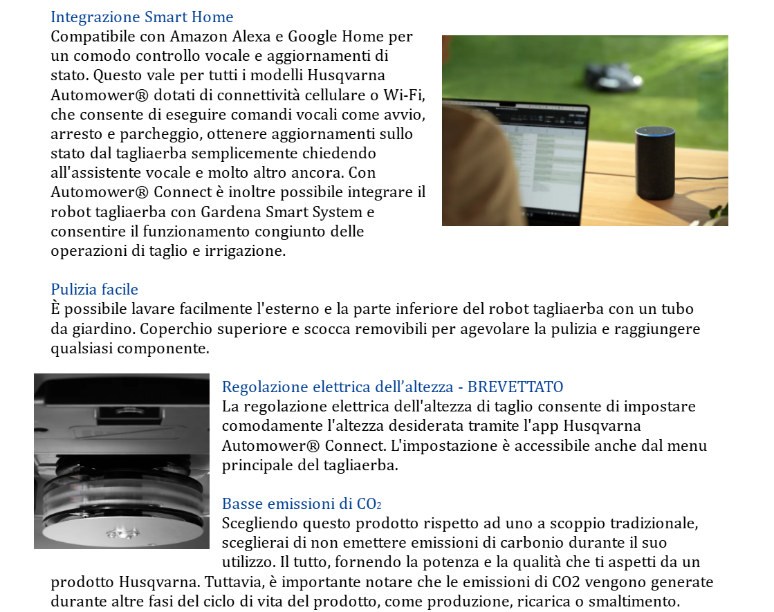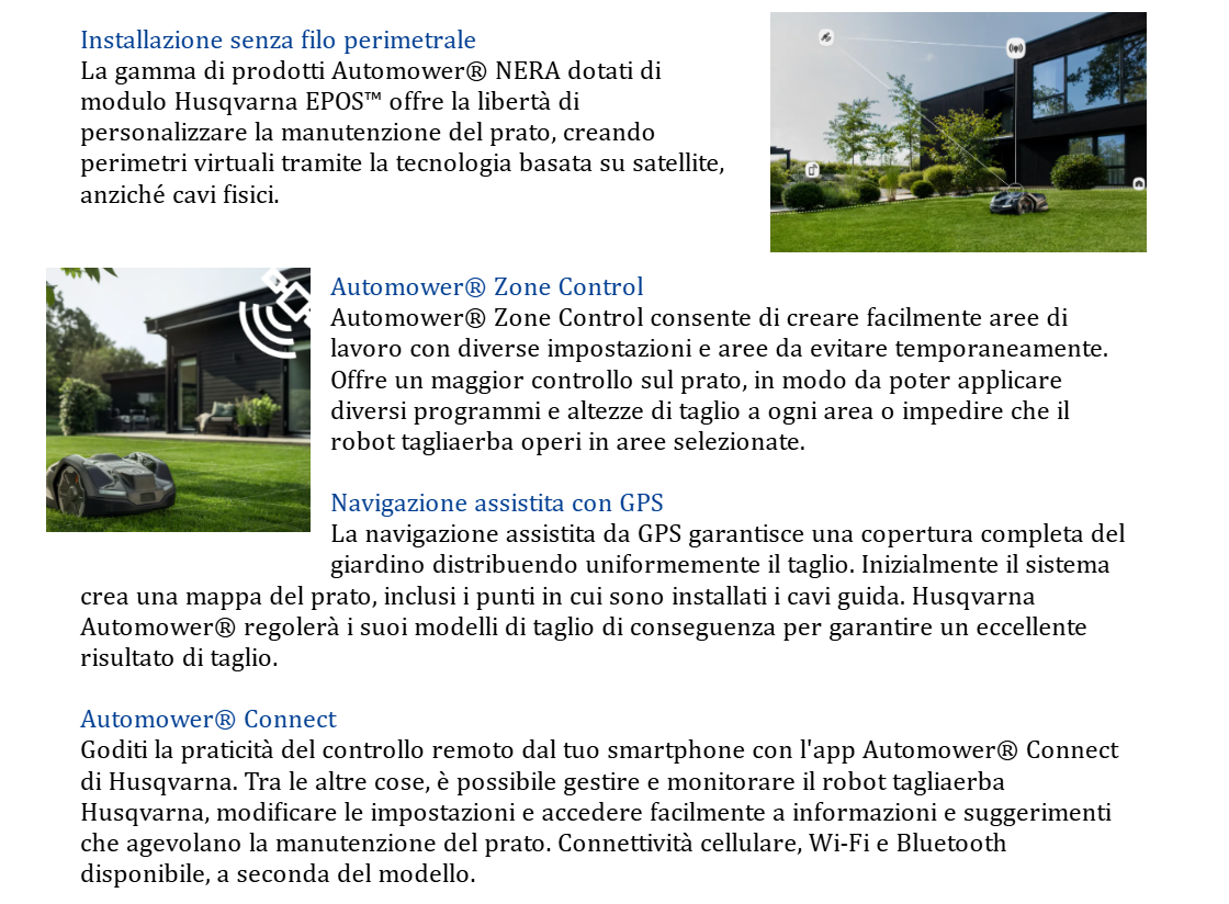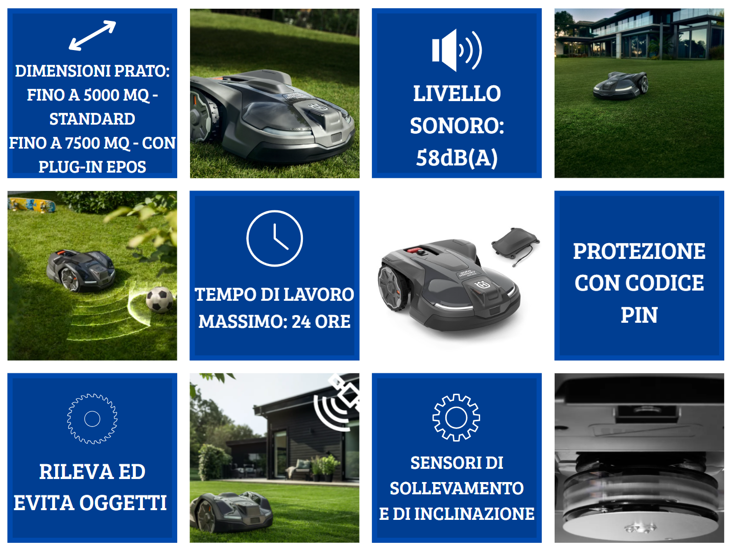 Husqvarna Automower® 450X NERA è un robot tagliaerba ad alte prestazioni ideale per prati fino a 5000/7500 m². L'installazione wireless tramite l'app Automower® Connect e il kit Husqvarna EPOS® (accessorio) consente di personalizzare la manutenzione del prato tramite perimetri virtuali, senza il rischio di rottura dei cavi. Gli arresti imprevisti vengono ridotti grazie a una tecnologia che aiuta il tagliaerba a evitare gli oggetti. Grazie alla mappa virtuale creata tramite GPS, è possibile attivare Automower® Zone Control, facilmente gestibile attraverso il telefono cellulare per creare aree di lavoro con impostazioni diverse e aree da evitare temporanee. Il modello 450X NERA può anche essere integrato con i dispositivi domotici, come Alexa o Google Home.