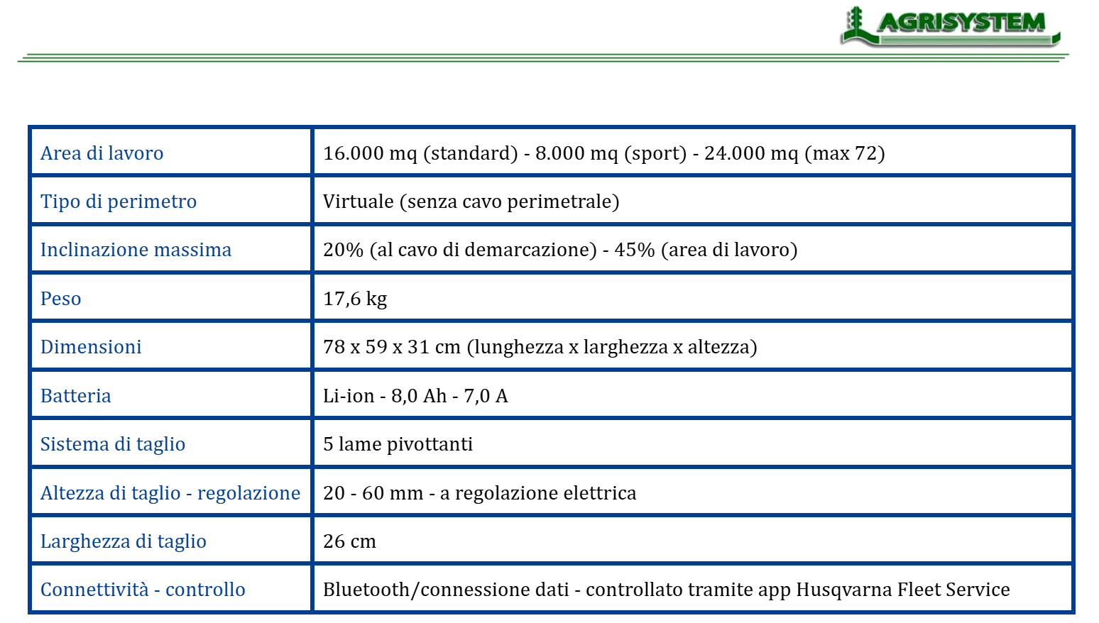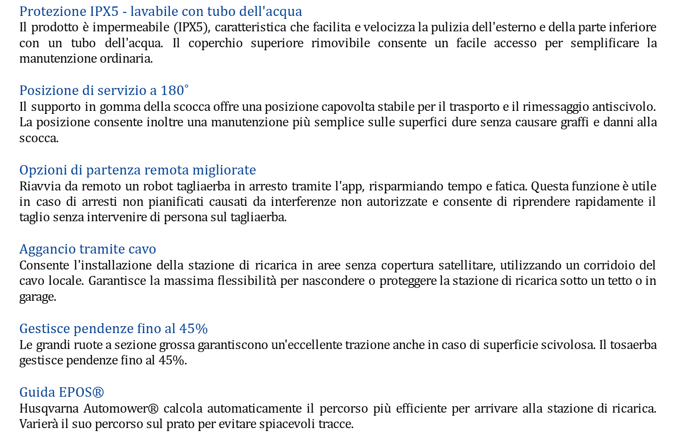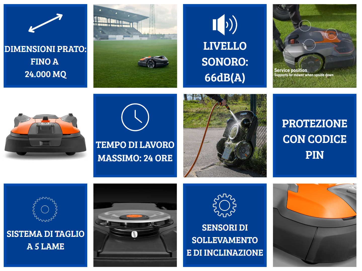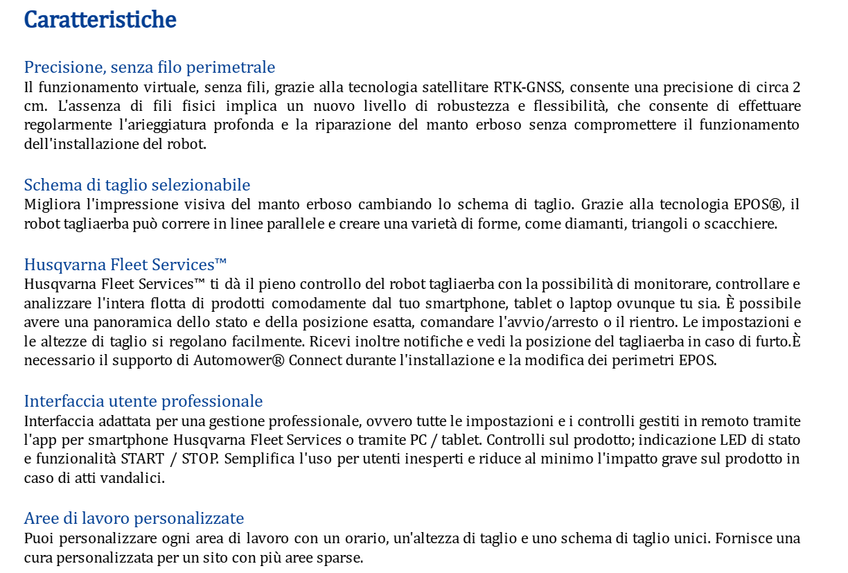 Husqvarna Automower® 580 EPOS®: un tagliaerba ad alte prestazioni per la cura del verde in aree commerciali complesse. Progettato per campi sportivi a manutenzione elevata che richiedono frequenti operazioni di taglio e un'eccezionale qualità dell'erba. È dotato di un motore di taglio straordinariamente potente, che garantisce risultati di taglio ottimali fino a 20 mm. La tecnologia Husqvarna EPOS® permette l'installazione senza filo perimetrale, consente di personalizzare le diverse aree di lavoro e impostare aree da evitare temporanee. Costruito con una parte anteriore in gomma rinforzata, questo modello offre anche spazzole per ruote attive, disponibili come accessorio, per migliorare la trazione. È richiesta la stazione di riferimento EPOS® RS5, non inclusa nel prodotto.